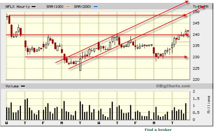 4/19/11 - Finally we get some ACTION with this stock. The price action was strong in the morning but tapered off into the close as the buys and sells tightened up. I am definitely bullish; however, if AAPL disappoints tomorrow you can be assured NFLX will stumble if not pull back. We still have three more trading days for this stock to position itself so I am looking for it to hold $240 and take out $245 on strong solid candles into the close by Friday.