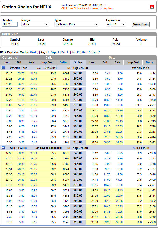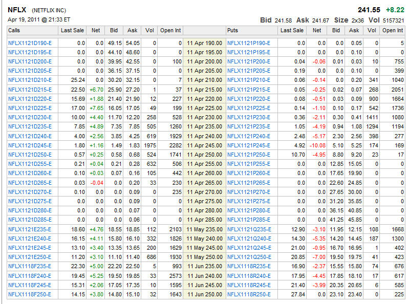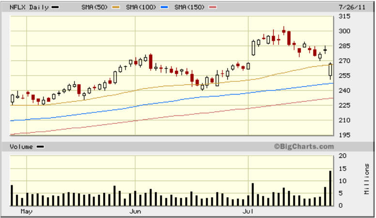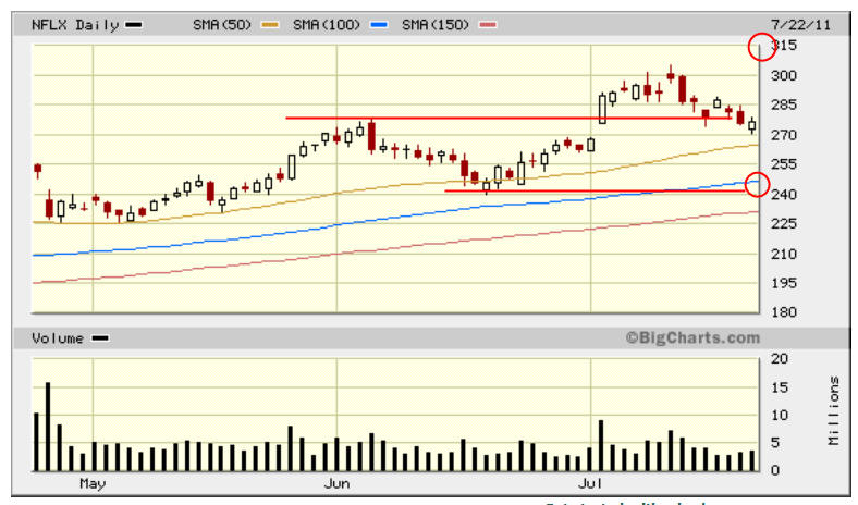 NFLX briefly took out an all time high of $300 per share back on 7/13/11, and once the price increase announcement was made, the stock has sold off since. Of course the stock is substantially over-priced, but people buy and pay a premium because of FUTURE projections that NFLX will continue to grow millions of "new" customers; however, once they top out—and they will top out due to attrition, competition and operating costs—this stock will fall hard and fast and my Lotto Option Trades will be there waiting to bag that White Whale and catch a boat load of cash too!—For now, any trades done on stocks like this have to be straddles unless you are just willing to gamble and pick a side.