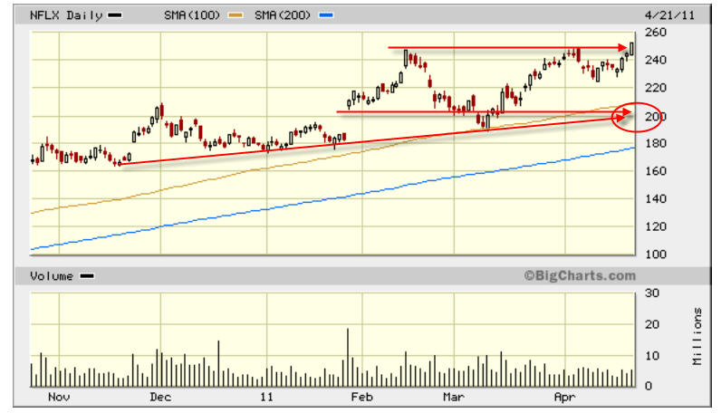 NFLX is putting on some upside as we head into earnings season. AAPL knocked it out of the park today which bodes well for NFLX since Apple sold 1 million more iPads than projected. This means there are potentially tens of thousands more subscribers for NFLX on demand packages since the iPad can play streaming content on WIFI and/or G3.