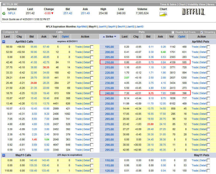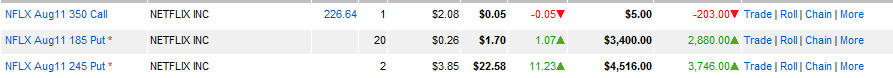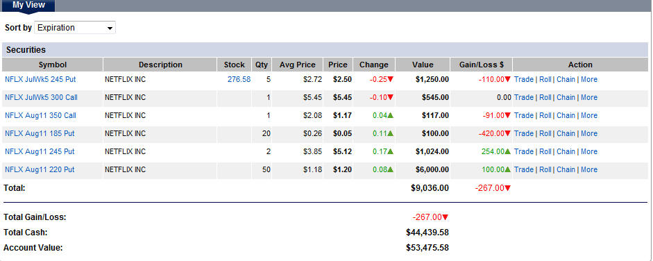 7/25/11 - As I expected, NFLX disappointed and the stock took a very nice beating in post market hours. Problem is the drop is not going to be enough to make my OTM puts any profits for now. I still have 3 weeks for the play to gain some momentum so we will see. I fully expect the calls to expire worthless so its time to manage. the rest of the puts and maybe do some ITM day trades to make up the losses.