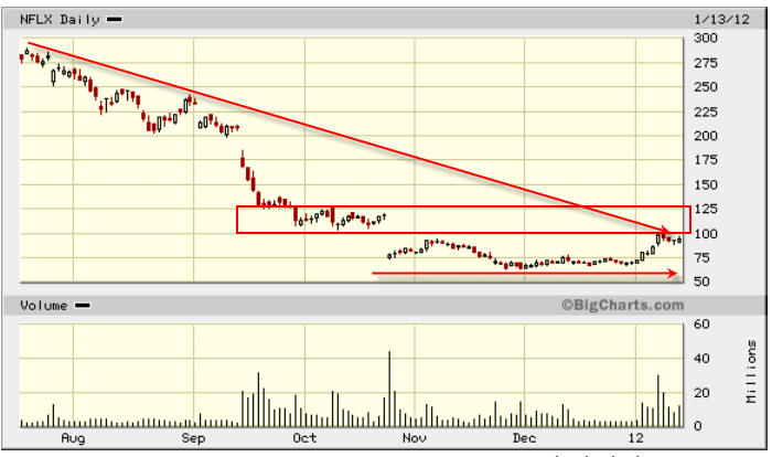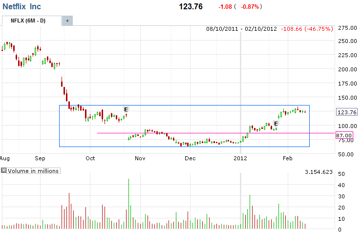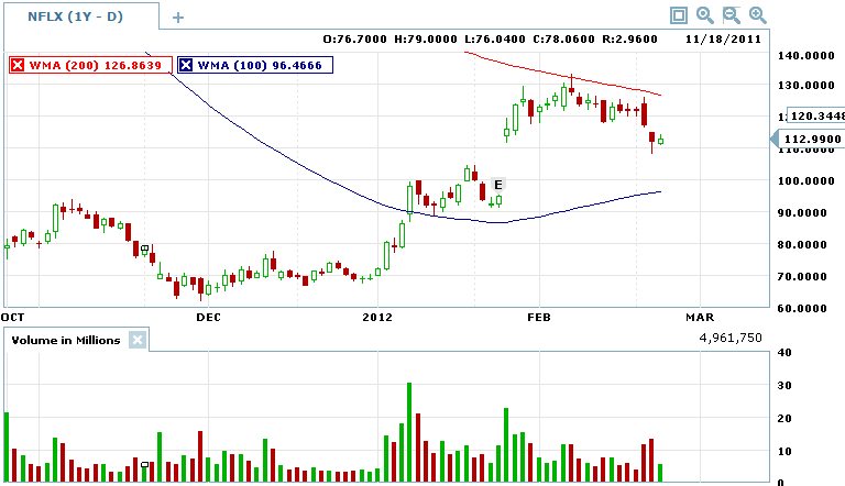=============================================================================================================== 2/10/12 - Pretty good week for Netflix, but pulled back quite a bit from the $133 high last Tuesday.. As you can see from the chart below, this is a pretty strong resistance area when the stock was pounded after 3rd quarter 2010 earnings. I am watching the price action at the $120 area and if this stock does not make a move back over $127-$130 next week I am going SHORT and staying short unless this weeks high is taken out.