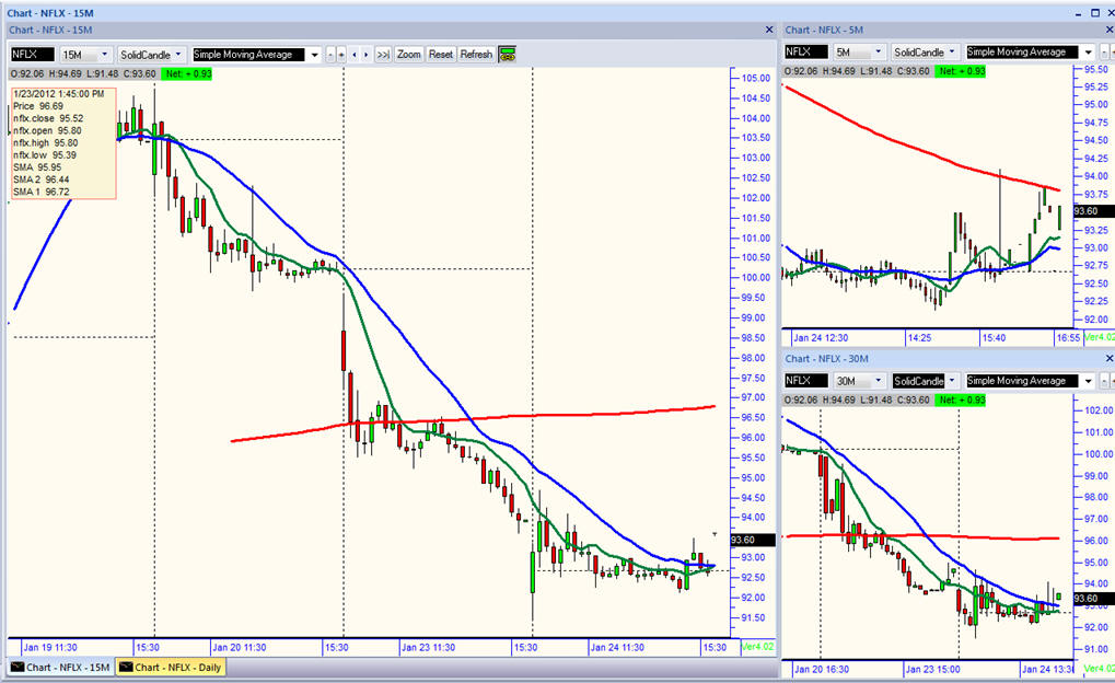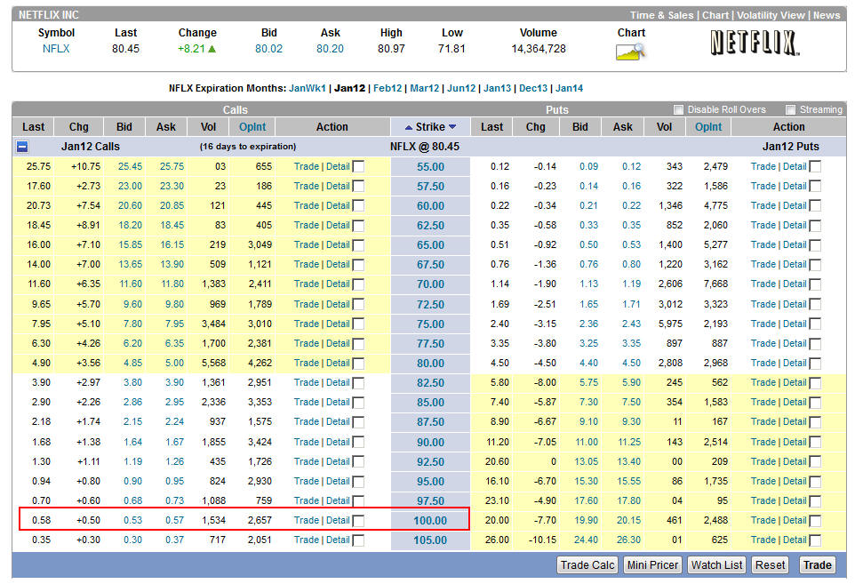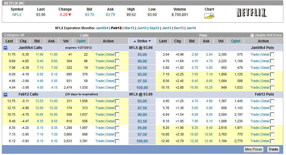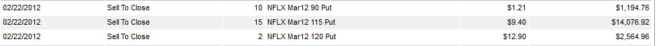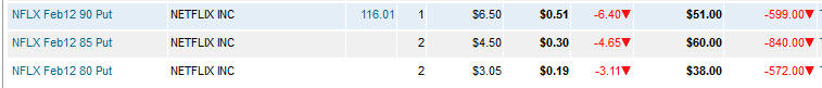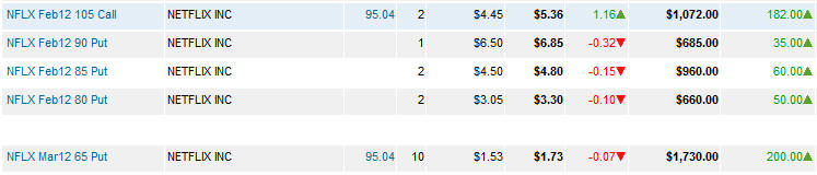 Currently, I have a new strategy working on NFLX and that one has made over a $10k profit and could keep on printing money if NFLX finds wings and keeps flying higher. If this stock fails to take out $120, I will look at shorts again. ======================================================================================================= 1/25/12 - NFLX beat estimates and the stock jumped in after hours trading. Will it hold? Time will certainly tell. They increased revenue above conservative estimates as well as streaming subscribers in the US and more than expected internationally. The loss of 2.5 million DVD subscribers was already priced into this earnings release. So far, the talking heads are touting NFLX as a stock to invest in so that translates to a buy for the most part, but not short term investment if you do. My Lotto put plays will not be making any money, but my calls should cover most of the loss on those if the stock gets over $110 as the month progresses; however, I will be watching how the stock handles $120 price ranges going forward. Even though this was good quarter, it was expected; therefore, most of this initial move is priced in and it will still take several quarters before big money institution begin to overweight this stock. Here are the options plays I put on this morning.