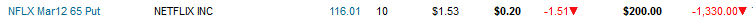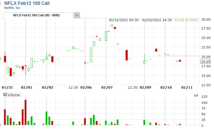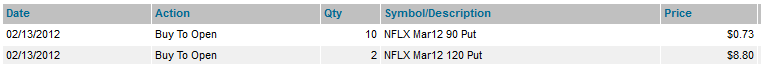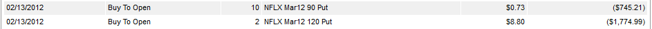 ================================================================================================================== 2/14/12 - No love on Valentines day for this stock. NFLX took a nice ride down today losing ($4.60) per share. I still want to see if they stay under $125 heading into options expiration. If the stock shows weakness tomorrow I will short it. Here are the current options I am holding on this stock: I will be looking to add more as the stock heads back down.
