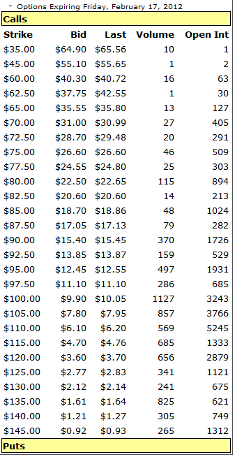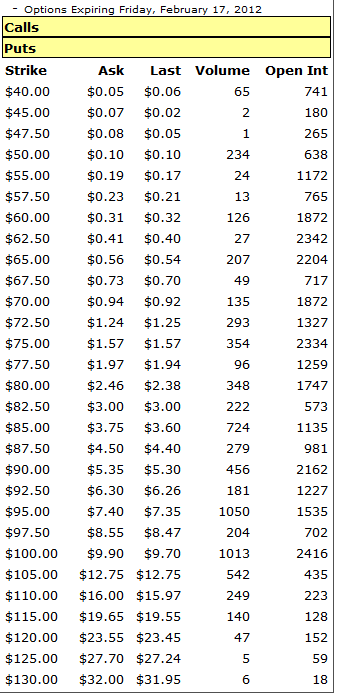 1/21/12- NFLX earnings are going to be this Tuesday 1/25/2012 and things are going to be explosive with this stock. If they miss again, it's lights out and this beaten stock will see sub $50 over the next couple of trading months...maybe even worse. However, if they at least meet analysts expectations, but more importantly, they have gained back new subscribers, then you can anticipate an initial pop in the stock price in post earnings; and an eventual continuation to the gap ranges from Sep-Oct 2011. How do you play this one is going to be tough because we have a new month starting on Monday and there will be plenty of volatility priced into this stock making the DOTM calls and puts expensive. With that said, I am suggesting you should break your contract load into a multi strike spread trade to get the best chance of making a profit. Here is list of options prices at Friday's close: