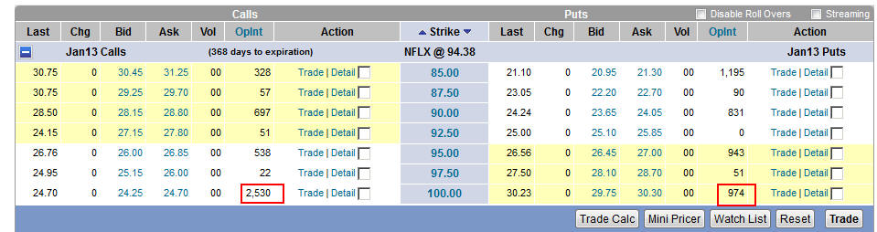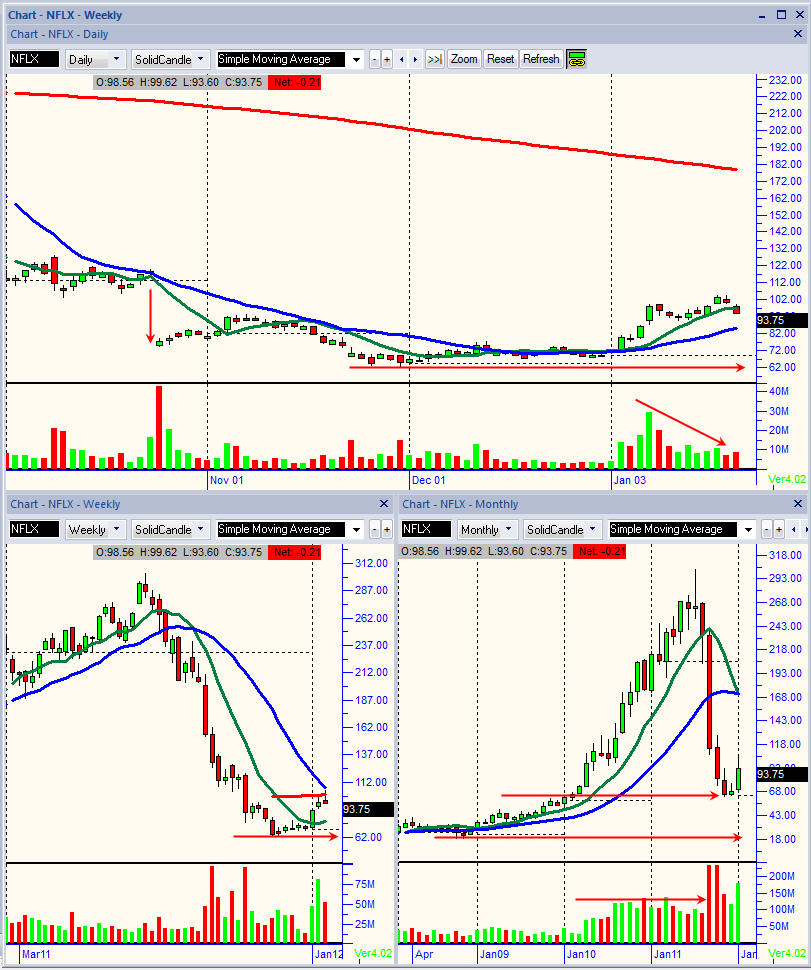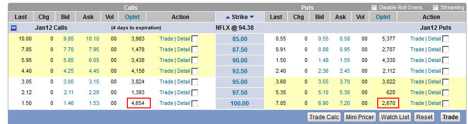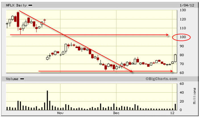 Looking at the charts, you can see there was a lot of volume today; however, its only the beginning of the year, so you cannot really place a lot of value on a single day of trading in a very beaten down stock. Remember, this stock will forever have to PROVE itself worthy of investor (meaning institutional) money to make a real rise in share price that will sustain itself and build long-term profits. You can be sure there are a lot of investors who hope to see a rise back to it's glory days of 2011, but those are the hopes and dreams of ignorant and novice investors. The real clues to what this stock will do is in the open interest of option contracts...the long term option contracts to be exact and the strike price you want to watch is the $100. Stocks on the move like to rise to the whole number and everyone likes to run a stock to $100 a share. It's more like a rite of passage than an act of conscience to hit the hundred dollar per share mark, so you need to watch for the open interest to rise at this strike price. The upcoming earnings report is Jan 23, 2012, so if this stock races to the $100 mark, you can bet every dollar it will be sorely punished by institutional investors if they miss and subscriber base has fallen more from the last earnings report. I love to play puts on this stock, but I know there are millions of investors with buyers remorse for not getting into this stock a few years ago; and they will be thinking today's action is the opportunity missed and buy with enthusiasm on any spec of good news so be ready to jump on the long side if that be the case. Going forward, we will have a lot of short-term opportunities to make quick profits if you are able to watch this stock daily.