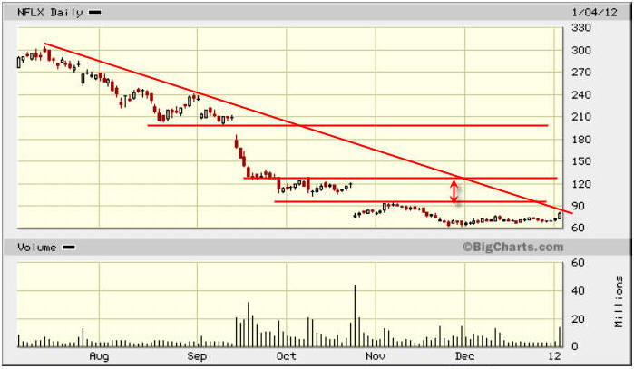 ========================================================================================================== 1/16/12 - The price action last week remained UNDER the $100 mark. This shows there are NO institutional investors ready to "buck up" and buy into the latest rally...hmmm...could that be a big fat STOP SIGN? Looking at the charts we have to discern the next possible move in order to get positioned for a nice profit opportunity. The target price ranges will be $125 on good news and $50 on bad.