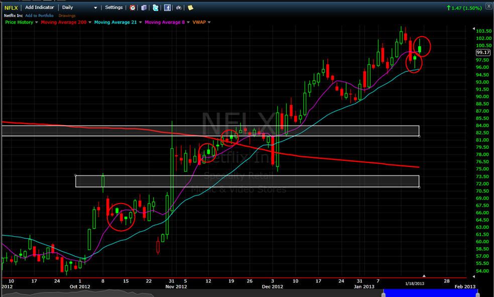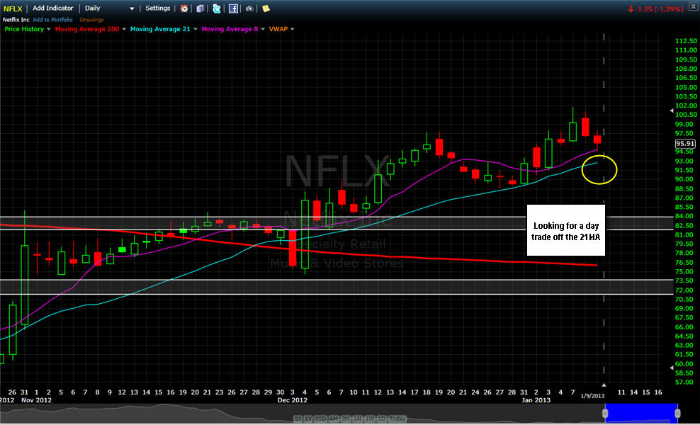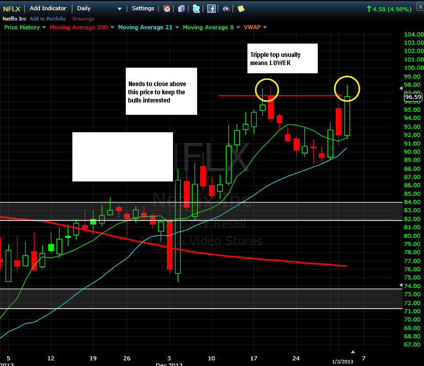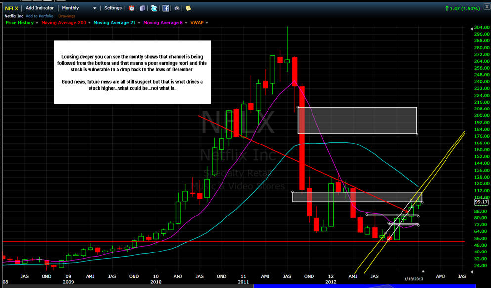 ================================================================================================== 1/18/13 - Patience when trading is what makes for the best opportunities to profit. As you have seen from my comments below, NFLX has given some good trading volatility and with earnings coming next week on the 23rd, there will definitely be a lot more to come. This quarter is going to be the deciding factor if this stock can get over $100 and stay over it for 2013. There are a lot of positive things coming for their future as well as a possible buy out or merger, but I think that as long as this stock is over $100, that is not likely to happen. Companies on the hunt to buy up other companies are looking for bargain prices; and when NFLX was down under $50, that was the bargain.