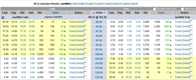 =================================================================================================== 1/7/13 - New content deal = $100 stock price. As I said below, NFLX will reach $100 and it did actually hitting $101.75; however, it did not close over $100 and was heavily sold off back to $97 before some more buying kicked back in. We now know where the speculators sell stops were placed which means we have a price range to base off of or drop from.
