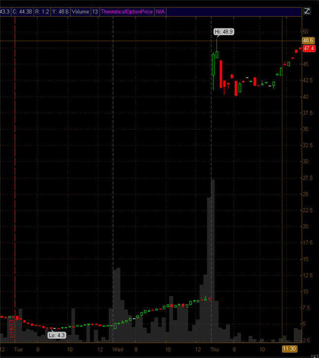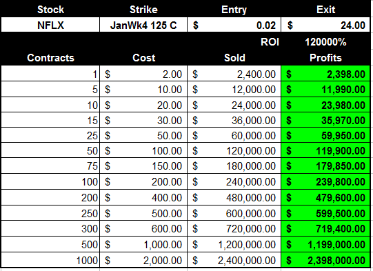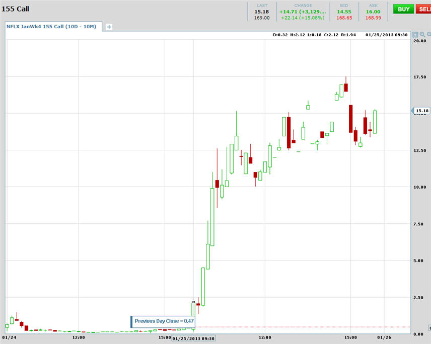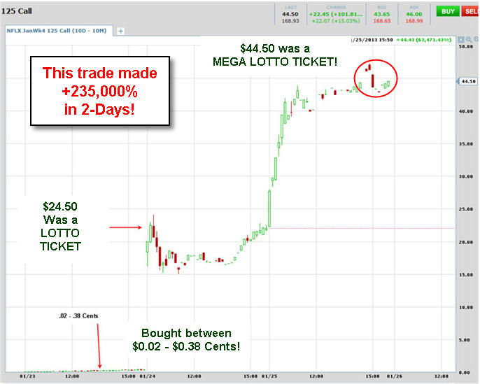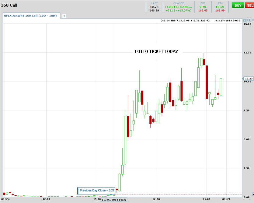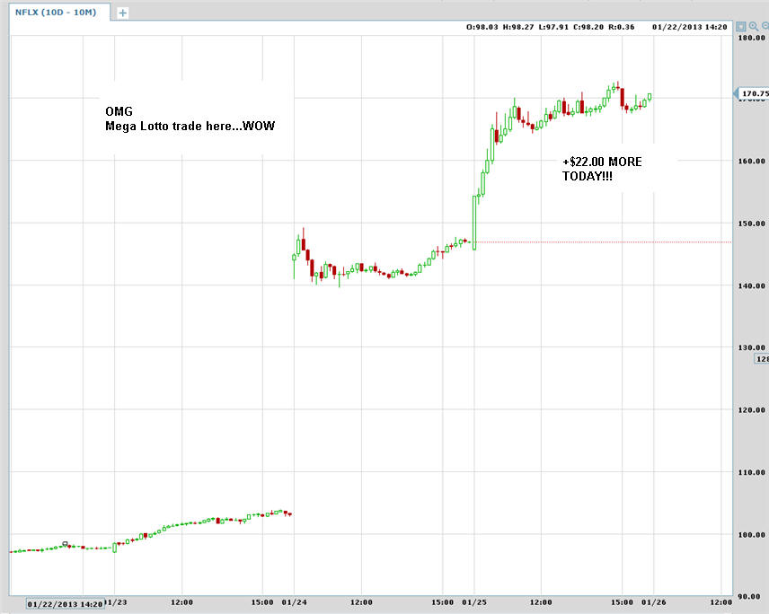 1/25/13 - Oh the Lotto Ticket that wins TWICE!!!!!!!!! Below are charts showing you what you can make with WEEKLY OPTIONS on stocks that move like NFLX did.