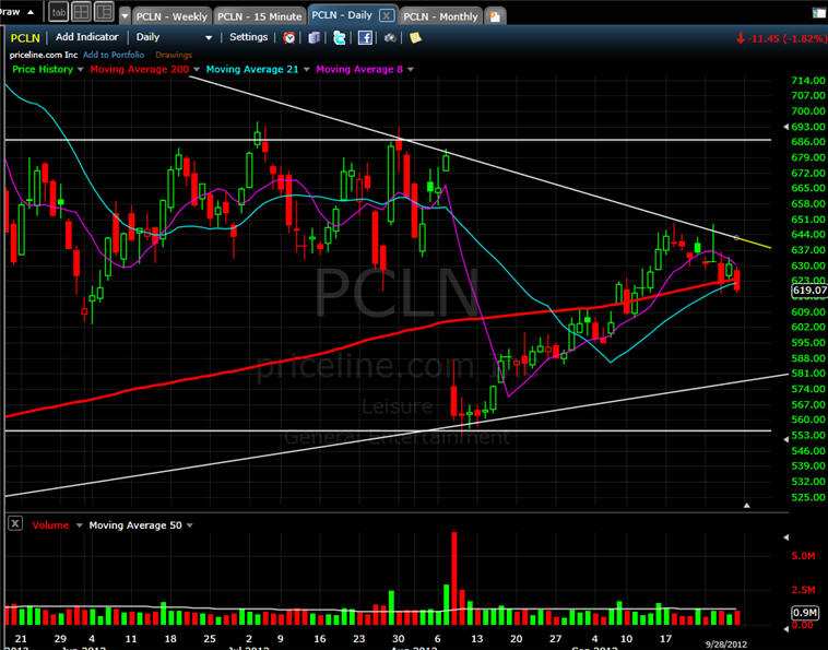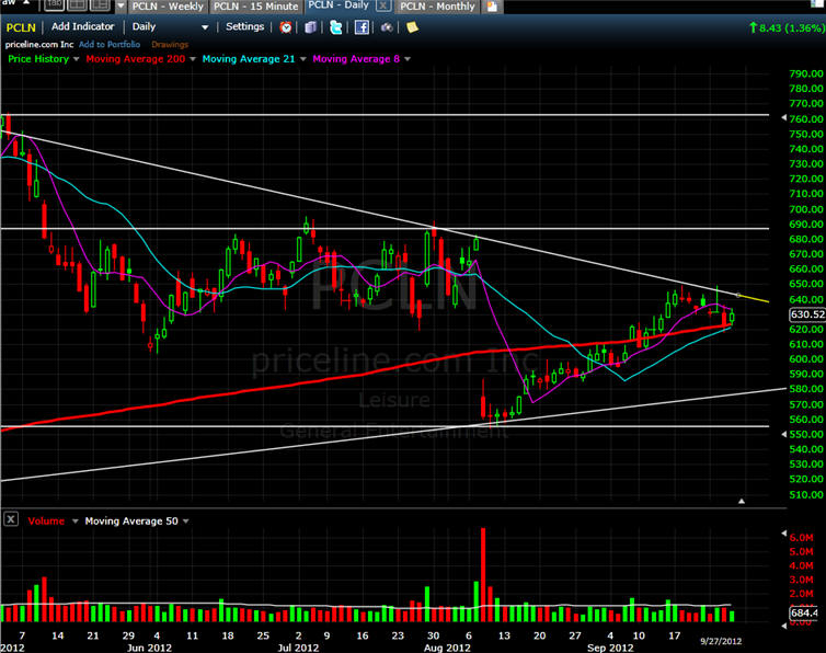 9/19/12 - So long as PCLN hold above the 200MA on a daily chart, I will remain bullish. Any turn for the worse in the markets, this stock will no doubt slip in price too. This stock has been hard for me to play with short-term options, so I am just going to focus on the Lotto plays for now and will look at the puts tomorrow since I have a call play going.
