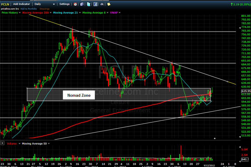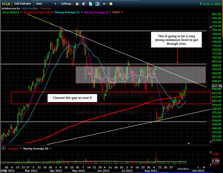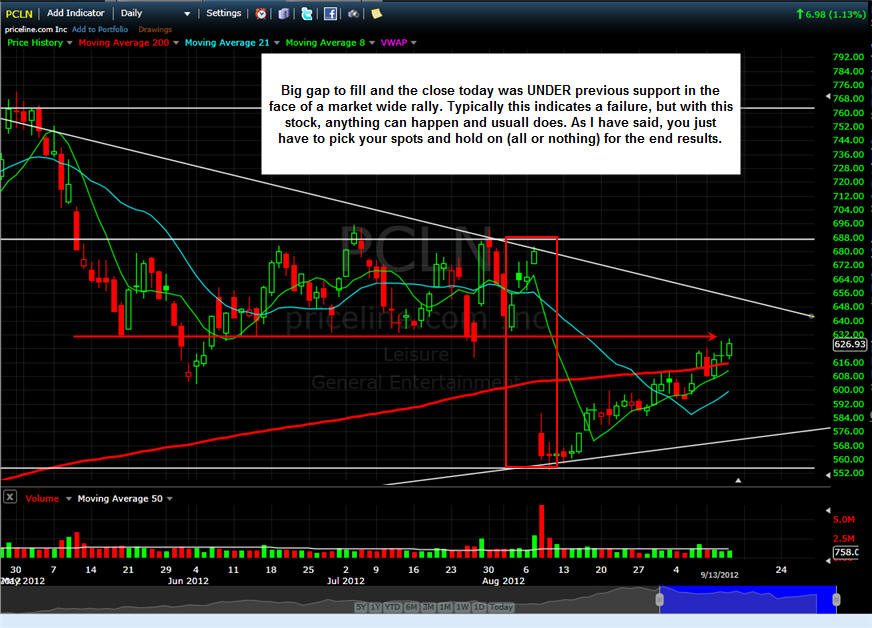 ====================================================================================== 9/14/12 - The heat is on and its looking like PCLN wants to buy one of its own tickets to fly back through the massive gap down it took from the last earnings report. With the markets getting into a bull rally mode, PCLN will just continue to rise with the tide; however, it was severely beat down, so that created a lot of pain for many investors; and any rise to a gap fill will most likely result in pull back to test the resolve of this stock.