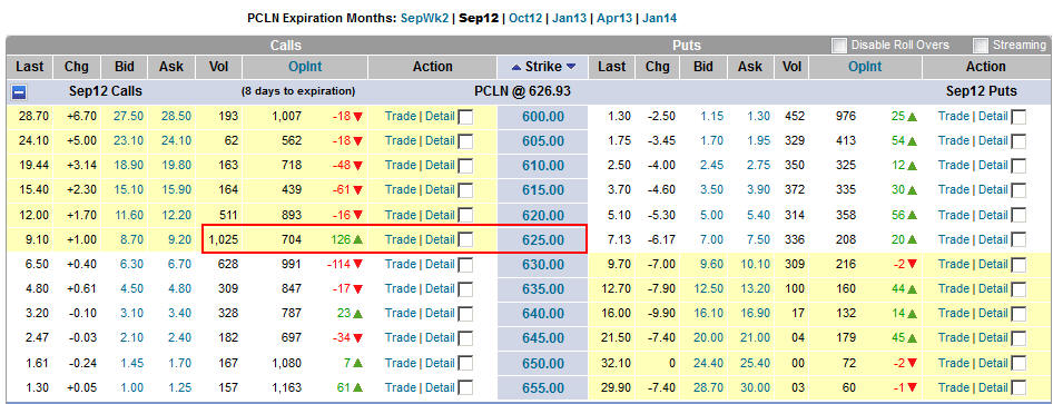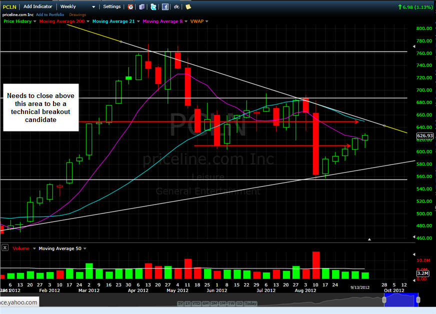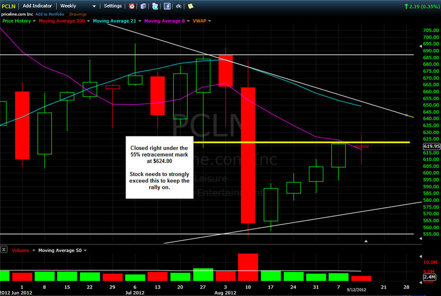 =========================================================================================== 9/12/12 - PCLN is an interesting stock to trade. It has all the action an option trader can look for; and all the anxiety that goes with it. If you trade this bad boy, then you have to just buy and see what happens because the swings from day to day can give you an ulcer; however, what I do like to do with this stock is shoot for the Lotto plays on Wed and Thursdays. I have been primarily looking for a short under the 200MA, but I am quickly giving up on that and going for a small call position to test the waters because the recent rise is only a retracement to just under the 55% price at $624 with average volume. If the stock does close back under the 200MA then I will get my short on too. When buying regular calls you should not go further OTM than 2 - 3 strikes because this stock tends to move around $20-30 when it gets going and you need to be ITM to assure you get a profit going. When buying weekly, we want our strike prices to be inside of an 8-10% move in the stock.