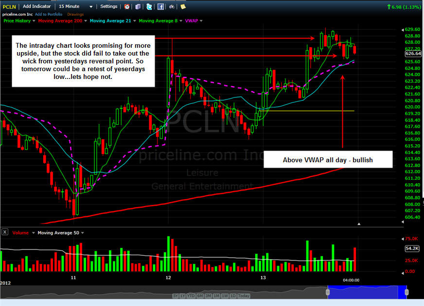 ========================================================================================== 9/25/12 - PCLN is a strong stock! Markets are selling off and this bad boy just hit cruising altitude? Not exactly liking the chart and if the market does not shake off today's reversal, PCLN certainly could trend lower. The gap down from last earnings has now been retraced over 55% so this stock now has to continue to hold the 200MA on the daily chart. If the stock does move lower tomorrow, I will pick up some puts