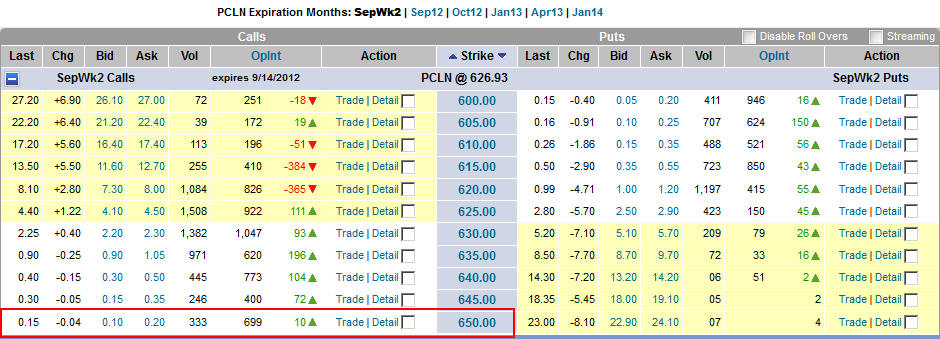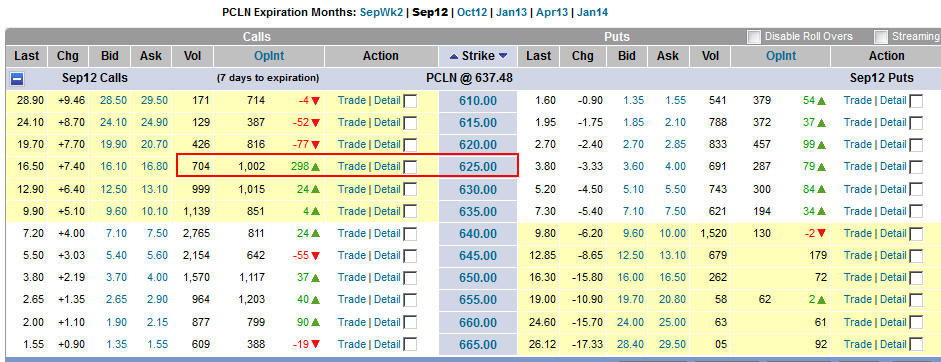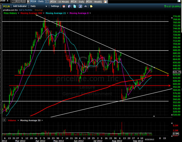 ====================================================================================== 9/13/12 - Today was a decent day in the stock but not a real winner in my opinion. With all the markets making big moves off the Fed meeting, I would have expected PCLN to bust out over the 55% retracement and close over $630.00. I am still hopeful it will finish the week strong, but this price area is pivotal and the weekly chart definitely shows it—If the markets continue to rise, PCLN should too. The weekly $650 are not looking too promising but we will see what we get. The Sept. options today show a lot of activity at $625.00 and the charts confirm it as resistance.