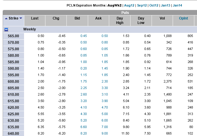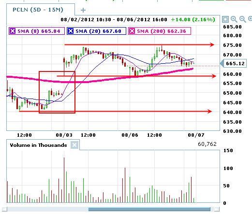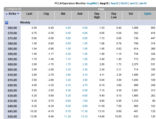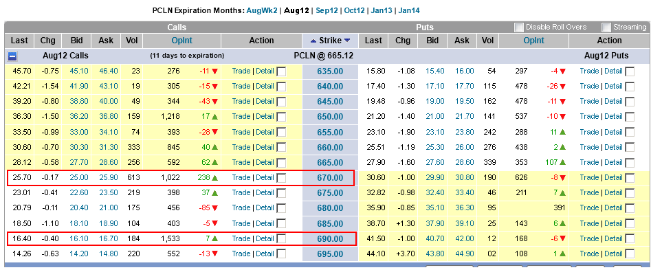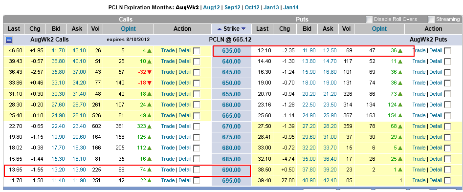 =========================================================================================== 8/6/12 - Tomorrow is the big day for PCLN. The action today started out strong, but went flat along with the overall markets. PCLN did hold the gap from Friday, so this could be a good indication there are buyers waiting in the wings. Looking over the options today I see a lot of open interest at 670 then 690 on the calls and on the put side open interest is 500 or less across several strikes. This means more investors are bullish, so if PCLN surprises, there will not be a strong short covering rally to add to the upside action. According to www.shortsqueeze.com PCLN has 3.1 million shares short which translates into 3.3 days to cover. That's not a large enough amount to take this stock over a 10% move unless they make a very unexpected announcement. Because this stock is so highly priced, the options are very expensive as well. The weekly options are ridiculous, so this time around, I am looking at buying no further than 5% out of the money. If you have a small trading account, I strongly suggest you sit this one out. The risk to reward ratio is very low on the weekly trade, so if you must, then buy the Aug expiration strikes and be sure to stay around 5% OTM.