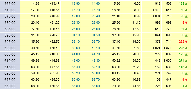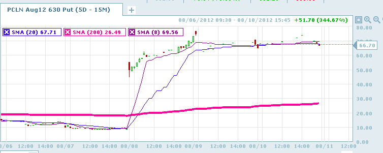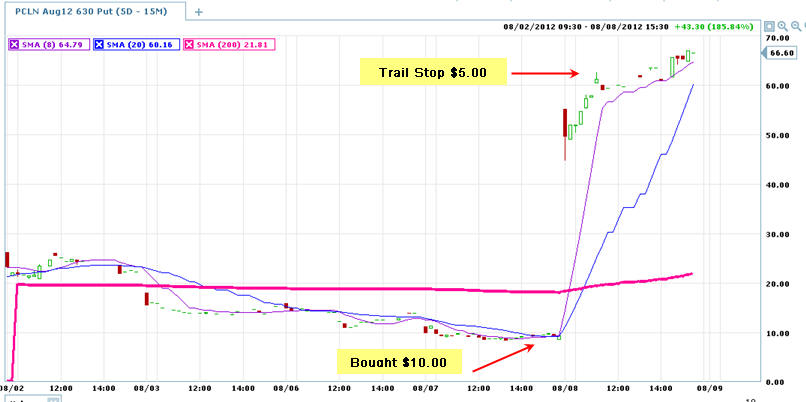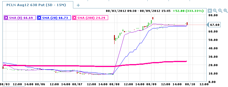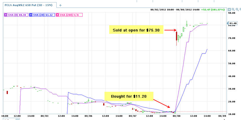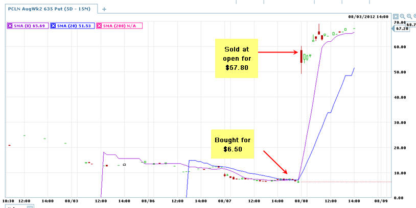 ========================================================================================= 8/8/12 - Wow, what an awesome trade we had on the put side!! Congrats if you were able to get in and even more if you are still hanging on. Of course, the calls will expire, but that is expected because we were doing a straddle play and as you can see below, the stock moved more than enough to pay off those losses and make a very nice profit! I am still holding the Aug 630 Puts with a trailing $5.00 stop. I will be keeping an eye on this stock for another opportunity to make some more money.