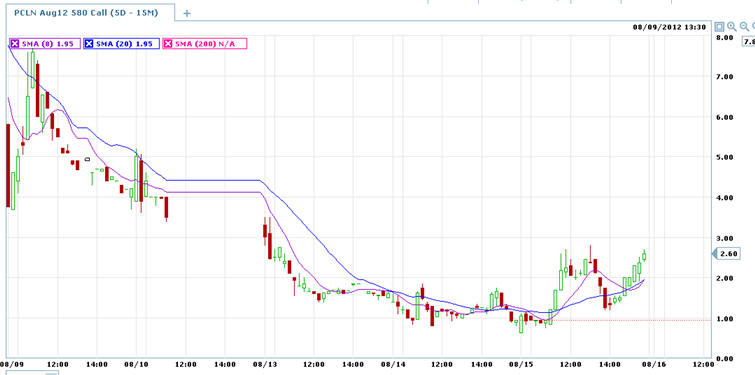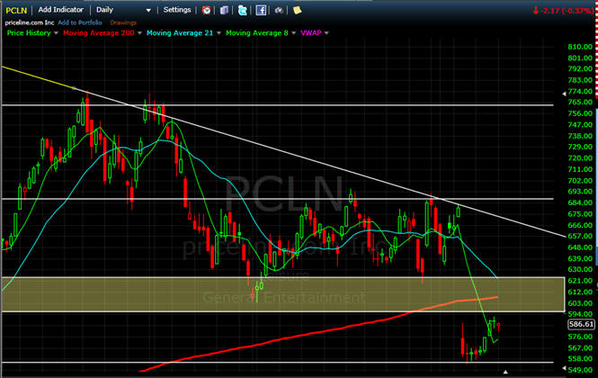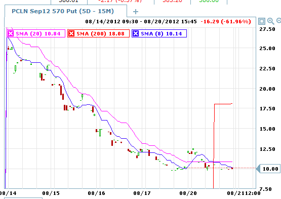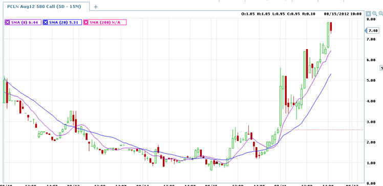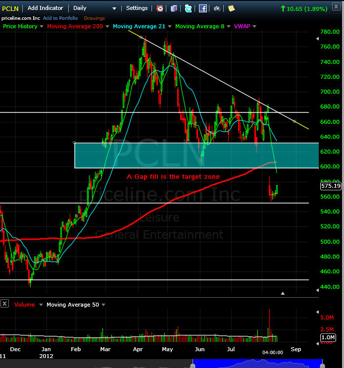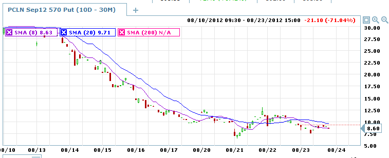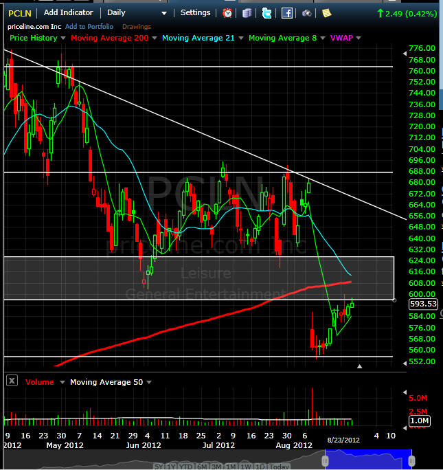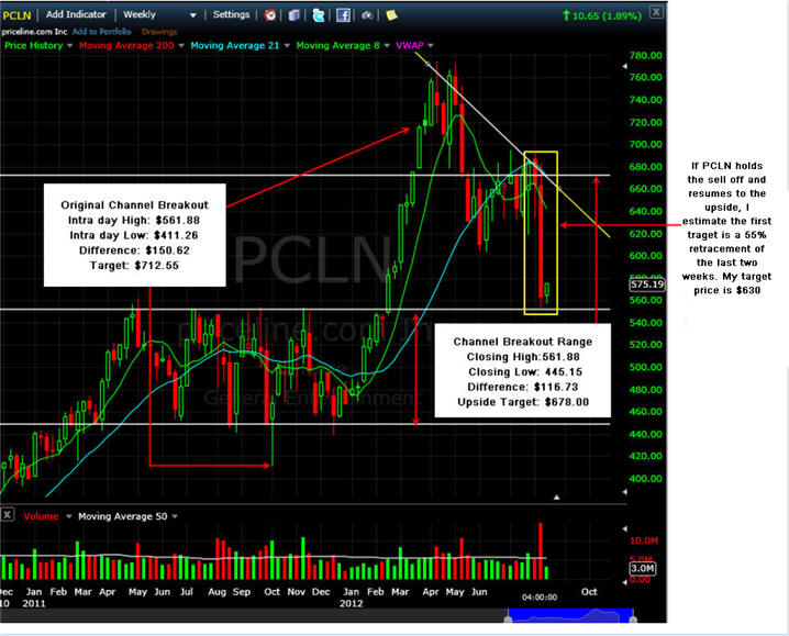 Ok, lets take a serious look at the charts for trading clues: The daily chart shows a solid stop of the selling at $565. That being said, any break below this would be very bearish; and for the next 1-2 quarters, any upside will most likely be slow and steady. This is not necessarily good for options traders because the implied volatility will make it much harder to gain profits on longer term options. Therefore, we have to look for pockets of sharp movements and trade weekly options. For example: If you were looking to buy out to the next earnings quarter (11/5/12), you would be looking at the November expiration; however, there are no options currently offered in November, so you have to buy out to Jan2013. Assuming PCLN does make it to my projected price target of $678, you would be looking at the 670 strike. As you can see, these options will cost you $23.70 per share and you are currently $75 out of the money. In addition to this, in order for these options to expire with a profit, PCLN would have to be trading over $673.00 per share on expiration day. Will it get there? It certainly could if the next quarter is a blow out, but it's a very high risk bet at this time. So, if you want to take a shot that the Negotiator will spark a comeback in share price, I would recommend you get the Jan 650 or lower strike. Anything higher and you are negotiating with the bus that took Cap'n Kirk down a few months ago. I am going to do a Naked Put play here and take that money to buy weekly calls and one monthly put. (I prefer to get paid to take a risk trade on a strong stock that I would not mind owning)