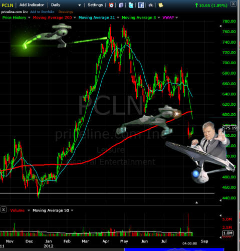 ========================================================================= 8/15/12 - Cap'n Kirk is back!! Did he bring the dilithium crystals to get the PCLN profit engines back online? It's poetic justice for the beloved icon/celeb that pretty much built Priceline's image. Go figure why management decided to lock Phasers on the negotiator (Shatner) and vaporize him from their commercials...not logical. Looking over the stocks performance from that decision, and you can say that good ol' Bills departure shat-tered the stocks price...lol