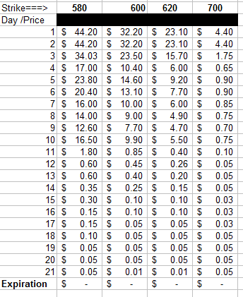 So, my trading enthusiasts, I am going to keep track (for educational amusement) of the life of four call options, for the entire front month, from one expiration day to the next. I am going to pick a beloved stock (GOOG) that has a ton of volatility (Vega) and show you just how much time decay (Theta) can affect your profits and or losses...especially on DOTM option plays. What you will find even more amazing is how much the price of the option will fluctuate (Delta) based on how much sun it gets...better known as "Gamma" radiation...lol—You know, I hear tell that if your get enough Gamma Radiation you could turn into a very big green guy ;-O.