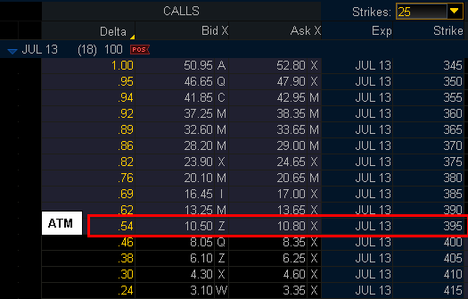 The most popular GREEK that traders hear about is called the Delta. The Delta is the underlying rate of change in the option price relative to the change in the price of a stock. Here is what a typical Delta value looks like:
