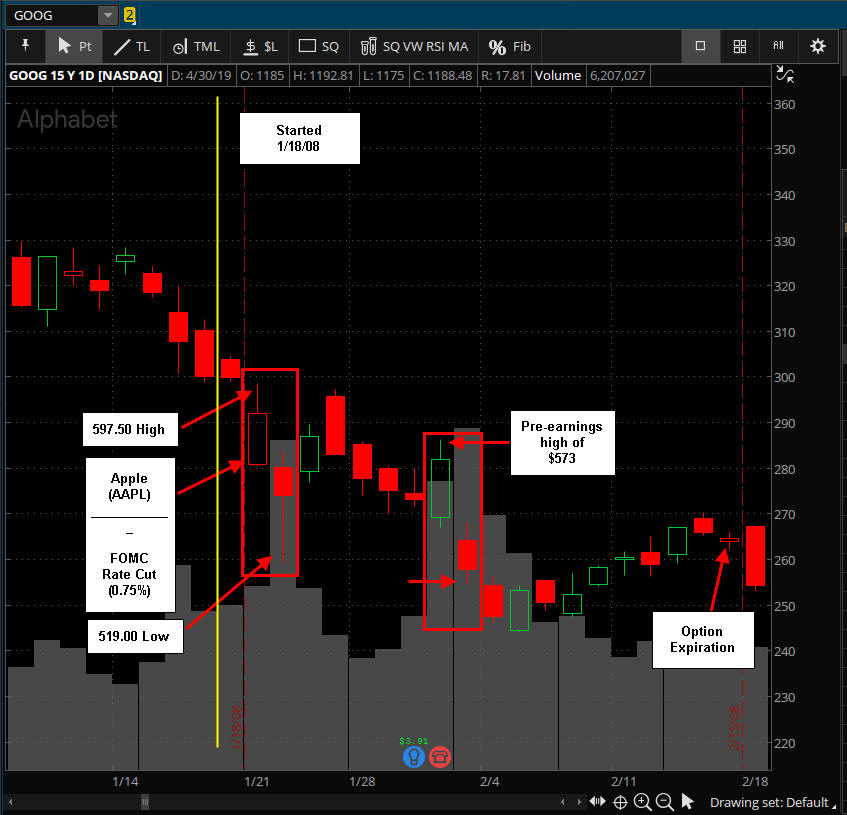 A typical Delta value for two strikes ITM option would be .70; and for ATM would be .50–0.60 and two strikes OTM would be .30–.40 and DOTM would be .10–.25. So, for every dollar a stock moves, your corresponding option would change in price based on the Delta; however it's influenced by all the other Greeks, and if you ask me, sometimes the price gets whacked around beyond the true Delta value my market makers—kind of reminds me of a story with a Trojan Horse involved. Oh, there is one more Greek you need to look at which is called RHO. This Greek is more like a horse race in that Rho is the change of the options price given a one percentage point change in the risk-free interest rate. HA! There is certainly no "risk-free" opportunity when it comes to options trading—and that is what makes it so much fun...that is, if you are on the right side of the trade ;-) Bottom line, if you want a lot less stress when buying options (especially weekly options) just buy a Delta of .70 and you will have more winning trades! Ok, on with the meat of this lesson. Google has been one of the hottest stocks over the past two years. It has very wide swings in price movement and reacts wildly to negative news, as well as positive news. The stock is extremely expensive, so millions of small investors use options to try and get their piece of this pie. What many/most of those investors do not realize is how dangerous trading a stock like Google with short-term options can be. As you continue, I am going to show you the wild price swings of this stock as it approaches an earnings release and how the option prices behave after earnings. This will give you a benchmark of actual experience to reflect upon, learn from and profit from to help you understand how to trade options in the future! Typically, GOOG likes to announce earnings the day before expiration; however, this quarter (Jan 2008), they are announcing in the middle of an expiration cycle, so it's going to be interesting to see what they say and what happens next. I hope you learn valuable insight and save/make thousands of dollars from this great example!