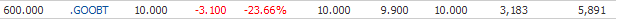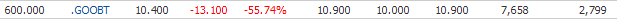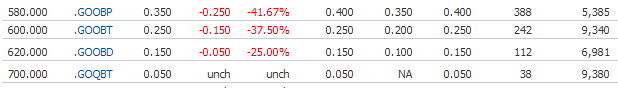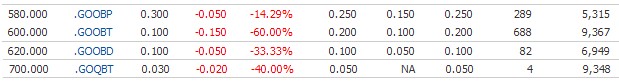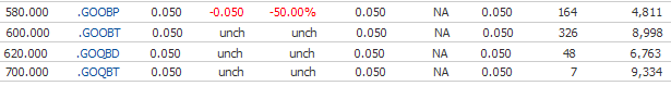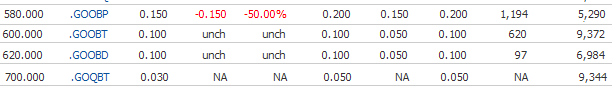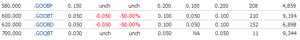 Another day of deluge as Google gets decimated in early market trading. Once the bottom was put in place in the overall markets, Google and others had quite a snapback rally erasing most of the losses on the day but the stock is still down a hefty amount of points heading into earnings. As you can see from the wide price swings in these calls options, you have to have an iron stomach if you trade Google.