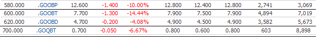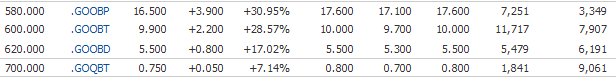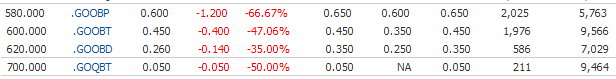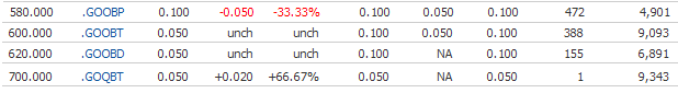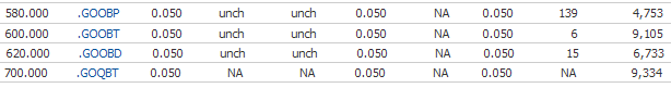 As predicted, all of the call options expired worthless! Notice the massive amount of open interest in each of them. That is the dumb money hoping Google would pull a miracle out of the hat and somehow rally back to profitability!