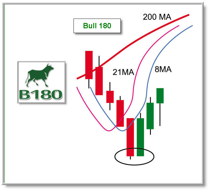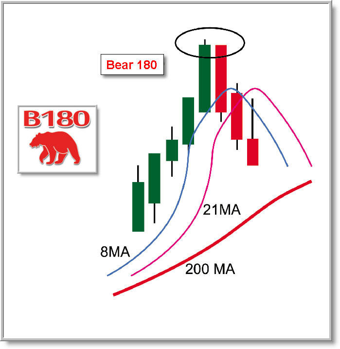 2. Look for a minimum of 4 bars UP for Bull 180 or DOWN for Bear 180 plays. You can also do 7, 12 and 20 candlestick bars—you are looking for the reversal off the Fibonacci pivot points: 5, 8, 13, 21.