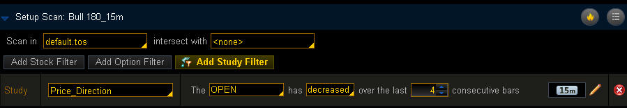 1. In the beginning, build a watch list of 10 stocks and ONLY trade on 15 or 30 minute charts for best results. If you have experience, then you can use a scanner to find more opportunities. TOS has a scanner (see below) that is effective and you can do this in TradeStation and Worden too.