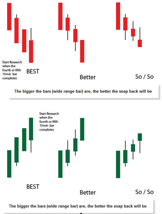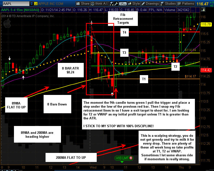 Start your research after the 7th 15 minute bar has closed. Calculate your ATR and then get ready when the next 15min bar starts. Ideally you want the 8th 15 minute bar to drop more than the ATR and also that distance away from the 8MA to confirm a better snap back. The instance the next candle turns  green, you enter the trade with a market order and put your  protective stop .05 - .10 under the previous bars low and move it up under the triggered green bars low once you have profits building AND STICK TO IT NO EXCEPTIONS!