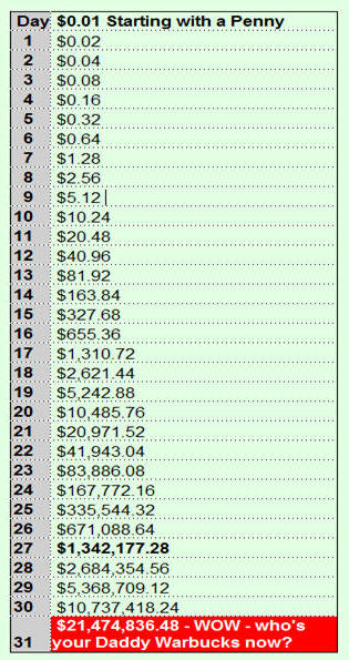 Many people will choose number one out of greed more than knowledge. In fact, it's been said that most instant millionaires will be broke in a short period of time because they do not know the true value of money; therefore, they do not respect it and quickly dwindle it to nothing because they never developed the skills to making money in the first place. I am sure you have heard this saying, "You know, money certainly does not grow on trees!" I have to take exception to this, because with proper trading disciplines, it can actually become a true statement; however, most people use it as a negative statement NOT to achieve wealth, when in fact, if you were to understand the concept of wealth accumulation; and master the disciplines to making it work for you, then you will indeed say..."money does grow on trees."—(read the book: "The richest man in Babylon...by George S. Clason) How does one make a money tree trading? It takes some time, commitment and a lot of (smart) work. Building wealth and achieving financial success is not an overnight process, but rather a journey that requires consistent effort and dedication. Here are the steps to creating your money tree: First you must prepare your soil (Principle #1, #2 and #3). Then you must plant your seed (fund your trading account). Next you cultivate and take care of your tree as it grows (Principal #4 and #5). As time moves forward, your seed becomes a tree of money that you can pluck from daily as perpetual wealth is continually accumulated! That my trading friends is true wealth in abundance! Wealth can renew, but riches can be wiped out—become wealthy and you, your family and your future generations can better control their destinies! Now, do you remember my question above? Did you choose the Penny? Some people realize I am up to something and will choose the penny, but really do not know what they have done. All they do know is it will probably be worth more than the million dollars, but have no idea what the compounding effect can do for them or how long it takes. Take a look at this chart below for the results of a penny doubled every day vs. taking the Million Bucks!