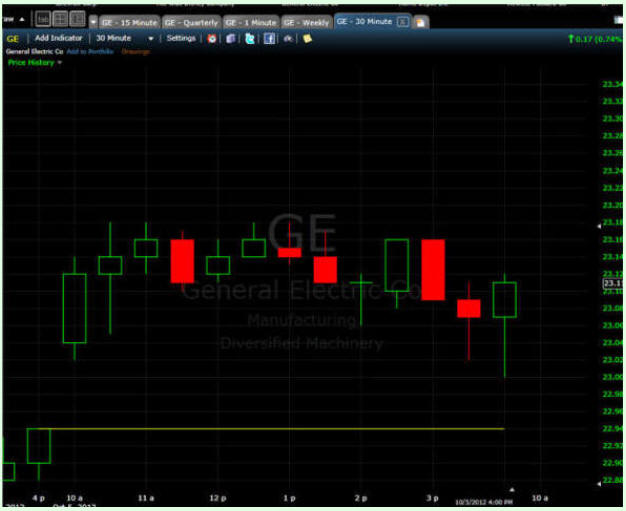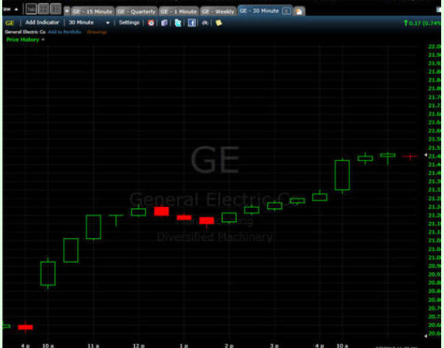 This part of my strategy requires a "day trading" account and that requires that you have a minimum of $25k in your account at the beginning of each trading day. By having a margin account, you will be given 4:1 buying power during the day and 2:1 if you hold over night; however, you must have a minimum of $25k in account equity each day you start, so the best thing to do is open an account with at least $30k to assure you have enough wiggle room to work your trades and maintain the liquidity requirements. If you do not have that much capital to start, then you will have to be patient with Lotto Trades and build your contract size with my compounding strategy until you get enough winning trades to grow your account the required amount for day trading status. I prefer a stock like GE it is a solid low priced stock that you can control more shares with and it has 100% liquidity, is traded heavily by large cap funds and the company is rock solid with low volatility just in case you have to hold onto your positions over night. So, if you have say $30k, then you can use up to 4:1 margin (never hold shares with margin over night) and control up to 8,000 shares with each trade vs gambling with a stock like AAPL or GOOGL and only be able to control 50 - 100 shares. Sure you may be thinking these stocks move so much more; and that gives you a quicker profit; however, it will give you an even bigger loss more times than a profit because your "fear/greed" instincts kick in and, well, sheeat happens in trading and that is a FACT! Remember, a trade is a trade, and what determines your gains is the number of shares you buy, not the movement of a stock—take if from me, trading slow and steady stocks win this race. When you start trading, NEVER open a trade with full margin. Once you are filled, you can adjust your position and add more share size if you need to. I would never recommend using more than 3:1 to add shares in order to get your desired profit. If you need to hold over night, you definitely need to go back to 1:1—you always have tomorrow to work your trade so why take unnecessary risks? Because GE is a Dow listed stock, it's traded by a Specialists and that is why I always trade GE off a 30 minute chart so you do not get "sub-pennied" or suffer whipsaw from the Specialists and bigger fish out there (trade robots, large cap fund managers or program trading etc.). To help you gain a slight edge over most retail traders, you can subscribe to the NY open book (a live quote feed that shows you the size of orders on both sides of the market); however, I do not recommend this unless you are going to trade more than 10k shares. Remember: If you are trading in too tight of a time frame, particularly a 1 or 5 minute chart, you are going to feel a lot of pain and frustration because a Specialist can manipulate the bid/ask spread causing you to get pushed around on your orders. Since we are only looking for $0.05-$0.10 cent profit targets, just spare yourself the frustration and use a 30–minute time frame to make your trades. Below is a typical 30-minute chart of GE: (+$0.17)