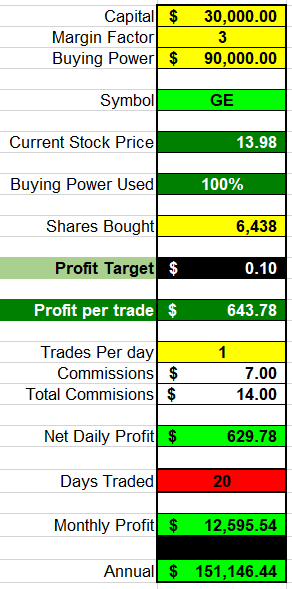 As you can see, the movements are predictable and consistent. You can easily get your $0.05 - $0.10 cents a day trading GE. The best way to trade this stock is wait for the topping or bottoming tails to show and then work you way in the direction of the Market to capture your profit. GE will follow the overall direction of the DJ-30 better than 90% of the time. So if the market is Up, then GE will be up and vice versa—by working with a larger time-frame, you will be able to make consistent gains every day without a lot of stress or risk. Ok let's do some math and see just how profitable this can be for you to build your Lotto Trade nets with. Taking into consideration that you will have a $30,000 trading account and use 3:1 margin when placing your trades, I have prepared some trading examples below; however, in the beginning I strongly recommend you start with 1000 shares until you are familiar with this stock and your abilities, then you can go with 3000-4000 shares per trade. Your target profit is between .05 - .10 cents per trade and once you get good at trading this stock, you can typically catch 2 - 3 of trades a day if the stock is making moves. Some days GE will trade pretty much flat all day and other days it will move well over $0.35-$0.75 cents so do not get greedy and force trades; there will be plenty of trades throughout the week to make money on—this is not a sprint, it's a marathon. Below are two examples of the possibilities when you are making just 1 successful trade a day: