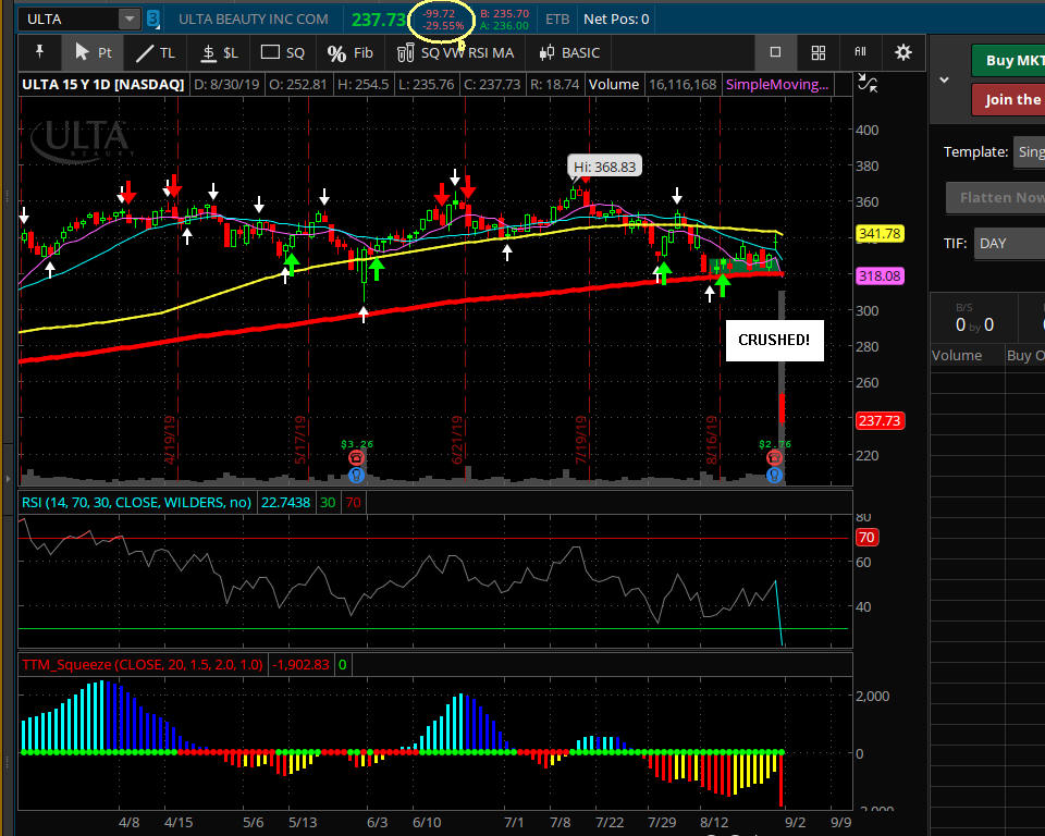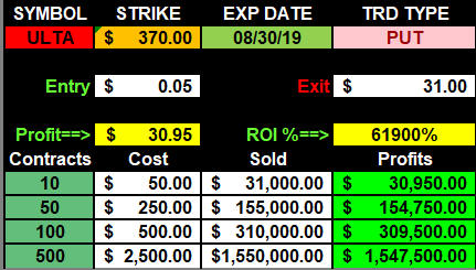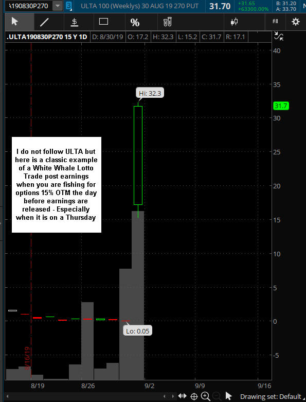 Some of my best picks that tuned into White Whales were on GOOGL, AAPL and NFLX. Google routinely announces their earnings the day before options expiration, so you can imagine the volatility that can happen with this stock. Sadly, it does not make the huge swings it once did before it was part of the S&P 500. Now there are too many fund managers who buy the stock making its moves more controlled, but it can still pay you off quite nicely when it does work out. Because Google is such a loved stock, you better believe that one day it will fall from grace, and when it misses earnings in a big way, I will be there with my nets to catch this mother of a White Whale stock! It's happened in the past and it will happen in the future! 2019 ULTA was crushed (29%) in after hours trading!