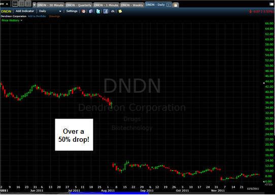 Session 3 — How to cast the Lotto Trade nets The best way to catch a White Whale Lotto Trade is to cast your nets down below the stocks you pick. Stocks fall much faster and harder than they go up, so using PUT contracts is where you will find the most profitable plays; however, we play both sides of a stock with both CALLS and PUTS, but I add more contracts to the PUT side for the big winners. The time to place these trades is either a couple of days before a major earnings announcement, FOMC or FDA announcements etc. and especially the week of options expiration during earnings season. What we are looking for is a stock that misses or received very bad news and in turn, gets whacked in price. You need to choose stocks with high volatility and the potential to make big moves in price. Stocks like: AAPL, CMG, GOOGL, NFLX, FB, BIDU, AMZN, TSLA etc. or any hyped up drug stocks with very publicized anticipated news events coming up like this example of DNDN had with it's potential prostrate cancer drug that failed to get FDA approval.