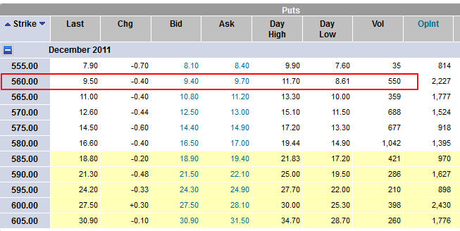 With the stock currently trading at $580, I would sell the $560 Puts because that gives me enough premium to pay for 2 contracts of my protective puts creating my Bull Put Spread. So, if you are trading 100 shares then you would sell 1 contract of the 560 Puts and take in $940.00 of premium.