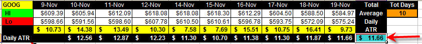 As you can see, the last 10 trading days of GOOG have an ATR of $11.66 per day. When you start trading this way, you  should work your day trades to capture 50 - 75% of this move per trading day. I like to keep track of 5 days and 8 weeks then I drill down to Daily 30 Minute ATR's.