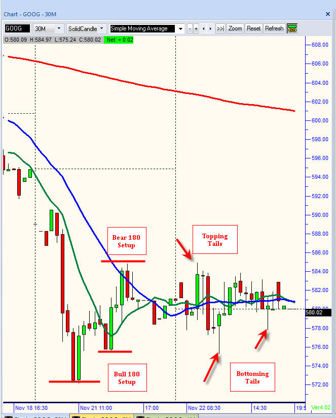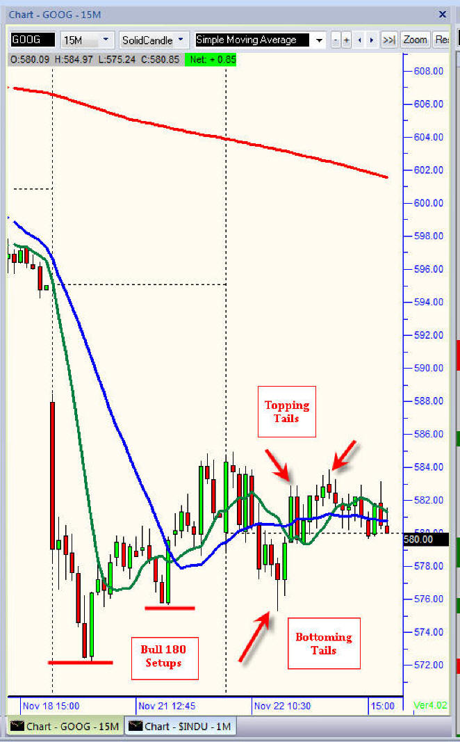 When you are day trading very expensive and volatile stocks, I always work with 15 or 30 minute charts because you will  get a lot of whipsaw on shorter time frames. It's much easier to see the bottoming and toping tails for more precise entry and exit points—I mostly prefer to trade my favorite pattern, the Bull or Bear 180's —if you see these, then load the boat because they are profitable 80% of the time!