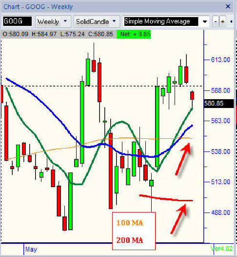 To make things even more lucrative in the event of a disaster, I would continue to accumulate more weekly DOTM puts and calls with some of the profits from my day trading activity. On the Put side, you should target DOTM options just above the 200 MA or within in a 10% move down. That way if GOOG gets a sudden unexpected drop in price, you can actually make a lot more short-term profits even though you get stopped out of your long shares.