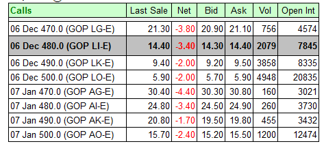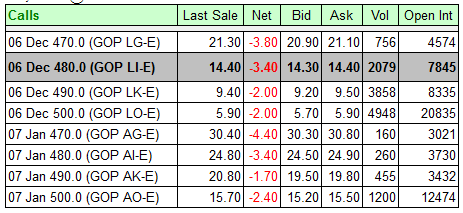 Session 2 – Surprise Surprise! Everybody likes to trade the volatile stocks because they think they can make a lot of money. This can be true, but many times, new option traders make very bad choices on strike prices and their timing is off 95% of the time. What do you think is the hottest stock to trade right now? You guessed it...Google! Today is 11/29/2006 and I want to show you how devastating a stock like Google can be to call option prices when it decides to go down rather than up. After the Thanks Giving holiday, Google sold off sharply and managed a slight bounce today. Will it hold? Only time will tell, but I wanted to post the closing prices on the options to show you just how dangerous buying ATM and OTM can be. GOOG $489.50 Prior Close Nov 29, 2006 @ 07:37 ET - Bid 491.50 Ask 493.75