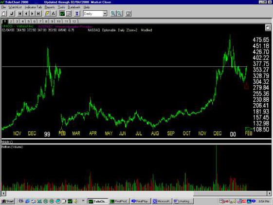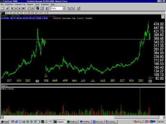 Now isn't this interesting? Notice that back at the end of 2000, I showed the support and resistance lines (figure 7). If you look into the future you will see that Yahoo came right down to my support line and then violated it with each subsequent stop at previous major support lines. Then at the end of 2001, the stock took on a nice rally and just like clockwork it failed at resistance from early 2001. Notice the lengthy recovery from mid 2002 all the way through the beginning of 2004. Why did it finally take out that resistance? They announced another stock split and it was happy days again. Once the stock split, it quickly rallied right back to old resistance from 1997!