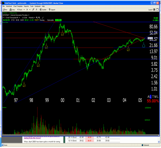 Now the stock is sitting at a very pivotal resistance line. It goes all the way back to the first split on 9/2/1997! See how the long-term trend line from its first all time high intersects with the last split? We are at a major crossroad with this stock. Simply amazing stuff! You really need to subscribe to TC2000 to capture the full benefit of un-adjusting the splits. www.tc2000.com