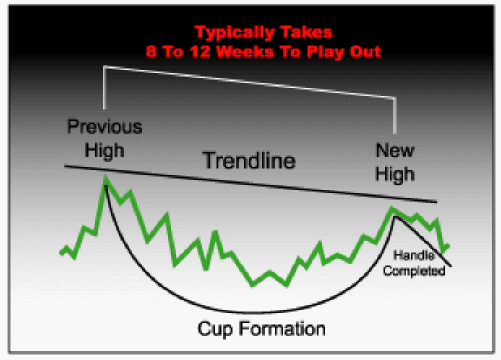 Patterns There are several types of chart patterns you can use to help you make good trading decisions. First up is my personal favorite...it's called the Cup & Handle. The Cup & Handle formation is very popular with technical traders. In fact, it's become so popular, it's very hard to get one to fully set up! What you want to look for is stocks that has had a strong move over the past 2 to 4 months. Once you spot that, you want to see it go through a slight correction; typically the stock will sell off into a slight correction for around 30% off its previous high point. If you find a good one, it will have taken 8 to 12 weeks to properly set up. Of course, the overall market conditions play a factor, so do not get married to the pattern.Now, once a stock moves up to test that old high, it should incur some selling pressure and this causes the stock to drift sideways for a few days to as much as 3 weeks.