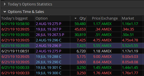 This was the top 10 contract volume on the SPY for 6/21/19.