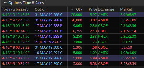 This was the top 10 contract volume on the SPY for 4/18/19.