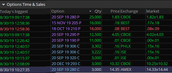 This was the top 10 contract volume on the SPY for 8/30/19: